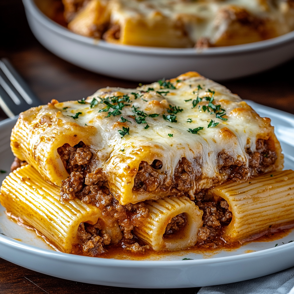 Baked Rigatoni Stuffed with Beef Ragu & Mozzarella is a comforting Italian dish featuring pasta tubes filled with a savory beef sauce and topped with melty cheese.