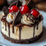 Once chilled, carefully remove your cheesecake from the springform pan. Drizzle generously with hot fudge sauce before topping with whipped cream, chocolate shavings, and maraschino cherries. Slice into pieces to enjoy!
