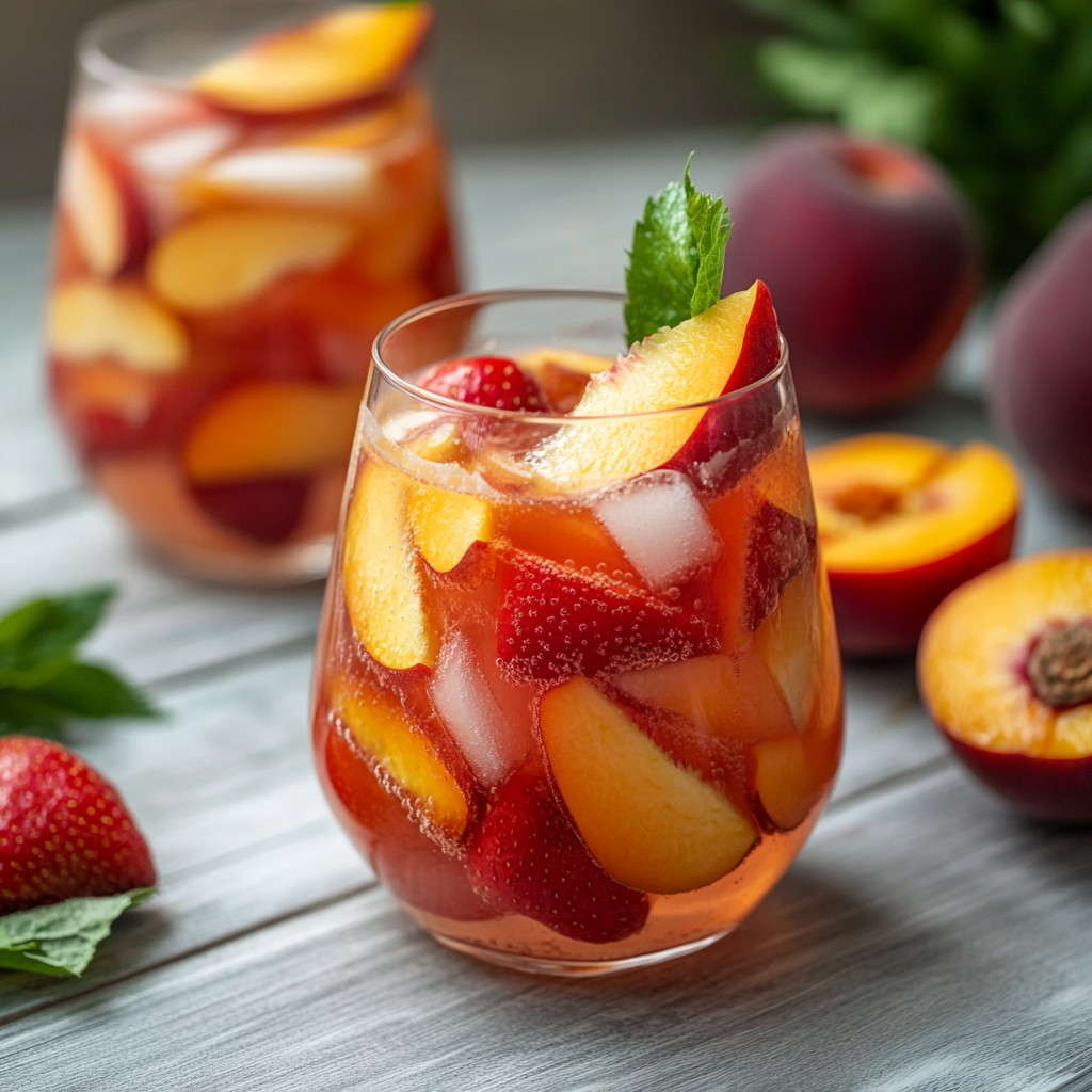A refreshing summer Mocktail, Strawberry Peach Sangria combines the sweet flavors of strawberries and juicy peaches with crisp white apple vinegar. This delightful beverage is perfect for parties, picnics, or any warm-weather gathering. Its vibrant colors and fruity essence make it a standout choice for any occasion.